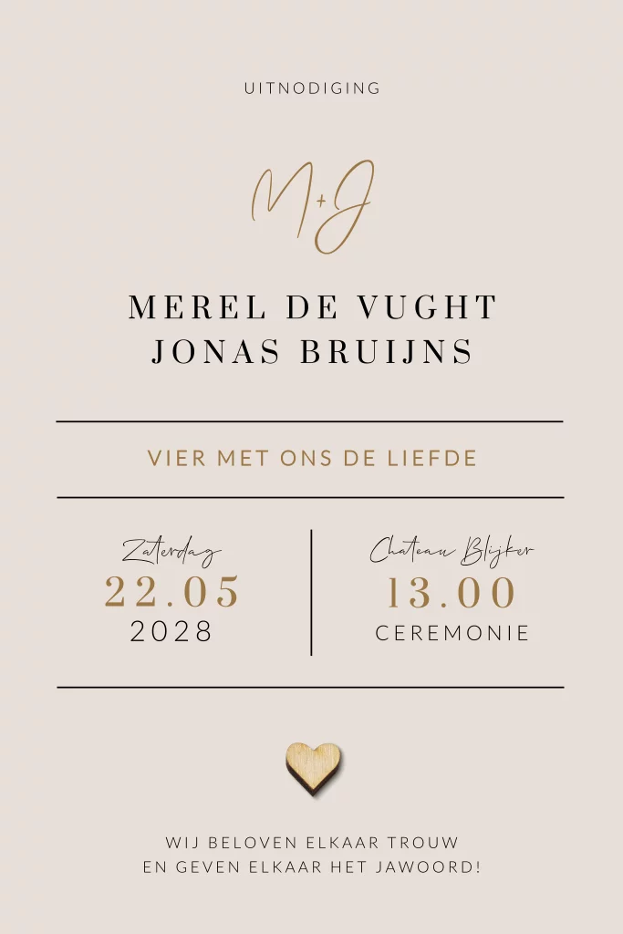 Rustige en cleane trouwkaart in zwart beige. Deze huwelijksuitnodiging met initialen is typografisch opgemaakt en strakke letters zijn gecombineerd met sierlijke letters. Teksten en lettertypes zijn aan te passen in de editor.