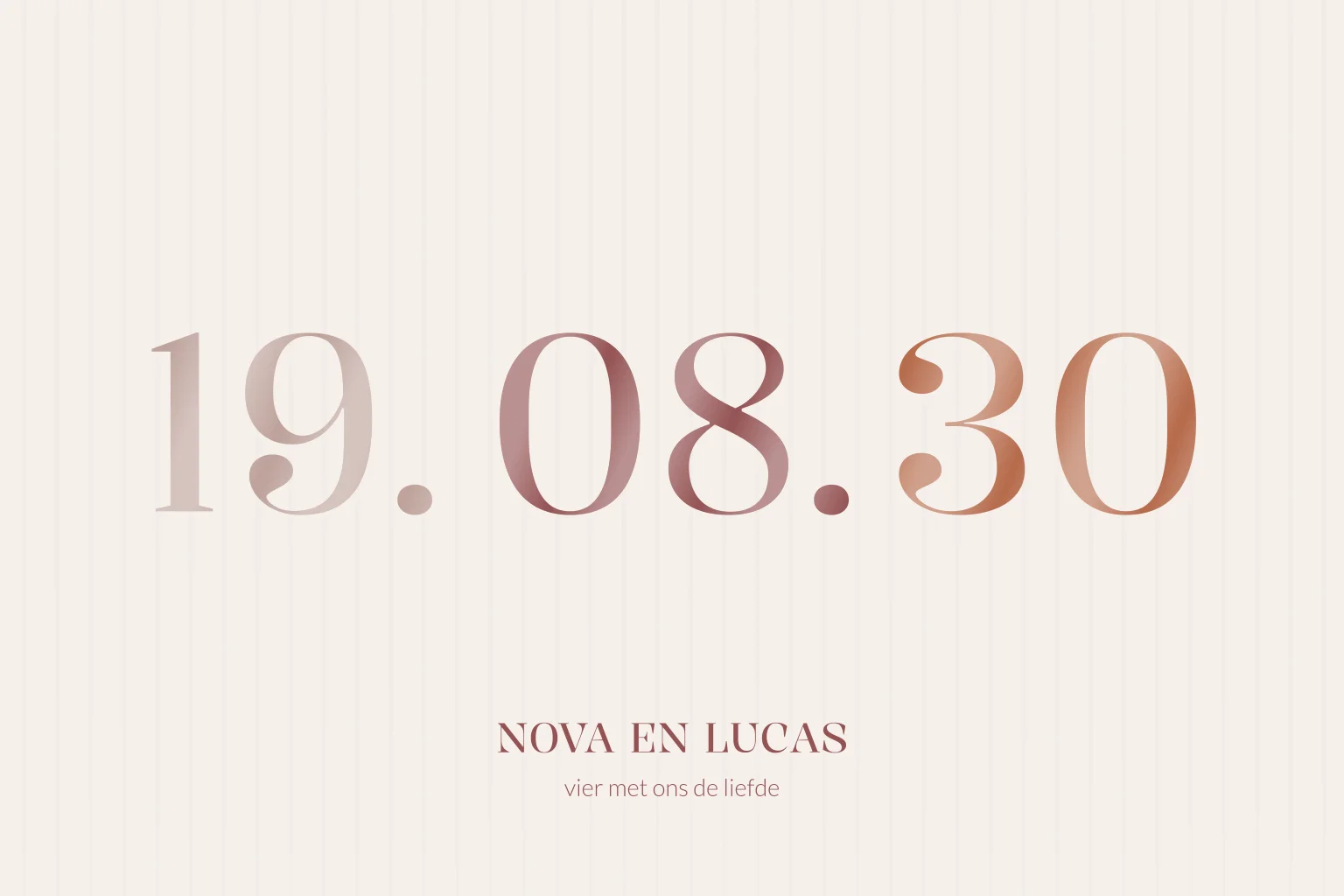 Een rustige basic trouwkaart met beige achtergrond en in hoogglans de trouwdatum in een mooie roze/paarse kleur. De achtergrond heeft een licht strepen patroon. Je kunt de kaart naar je eigen wensen aanpassen in de editor. Hulp nodig bij het ontwerpen? Neem contact met ons op!