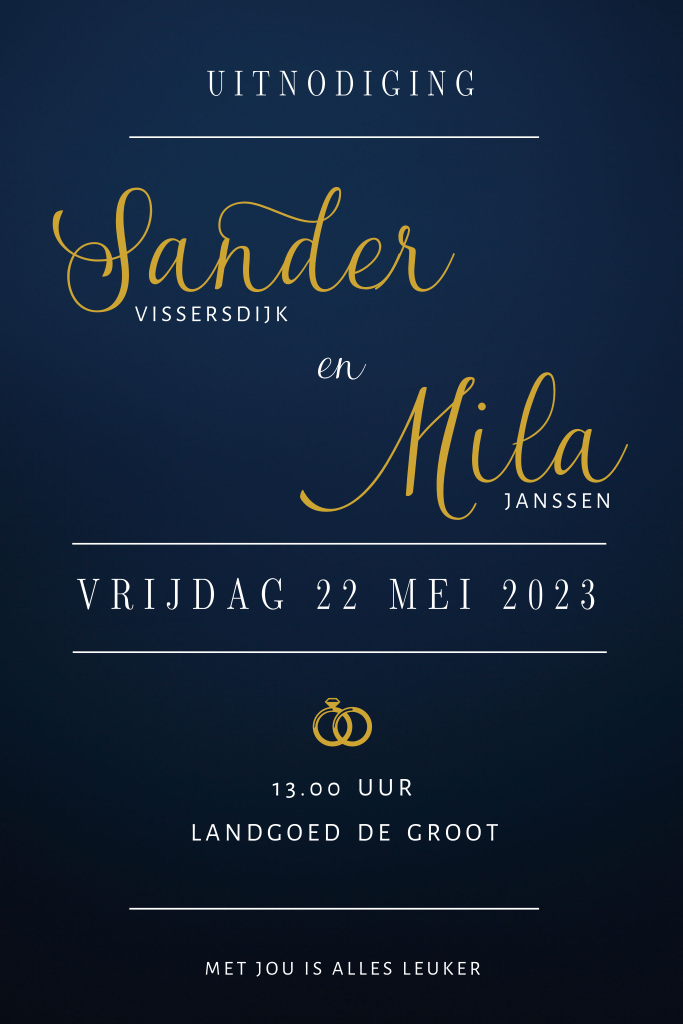 Hippe typografische trouwkaart met een symbool van trouwringen. Op deze uitnodigingskaart met donkerblauwe achtergrond staan de namen van het bruidspaar in een sierlijke handwriting letter geschreven. De teksten en kleuren zijn gemakkelijk aan te passen in de editor.