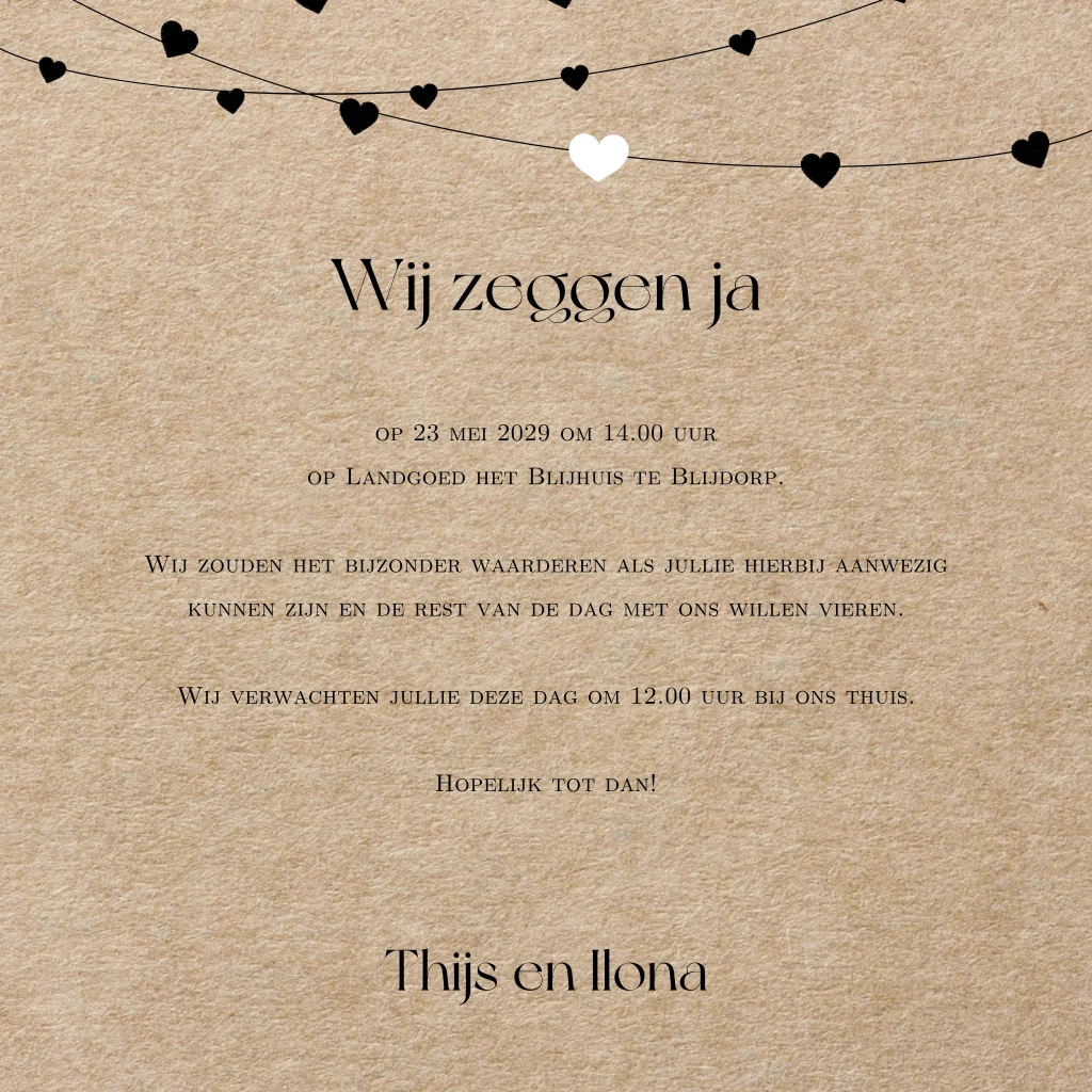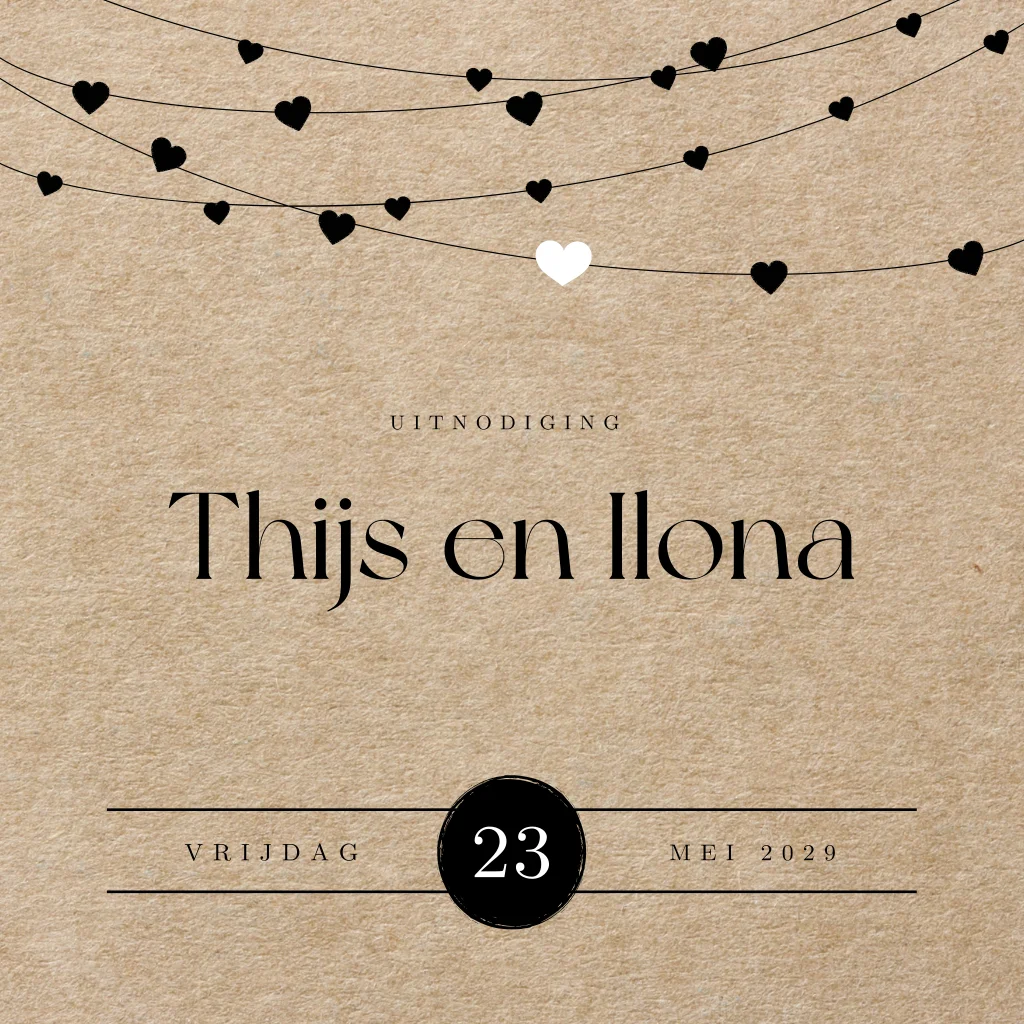 Romantische typografische trouwkaart met handlettering op een karton achtergrond. De hartjes slinger maakt de kaart extra feestelijk. De datum van het voorgenomen huwelijk staat prominent op voorzijde van de kaart.
