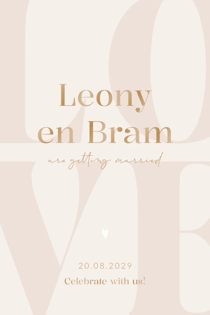 Kies voor deze unieke beige trouwkaart die perfect past bij jullie love dag! Dit is een trendy trouwkaart met de letters 'Love' in grote letters op de achtergrond. Pas deze typografische trouwkaart met hoogglans naar eigen wens aan in onze online editor en maak er een onvergetelijke dag van.