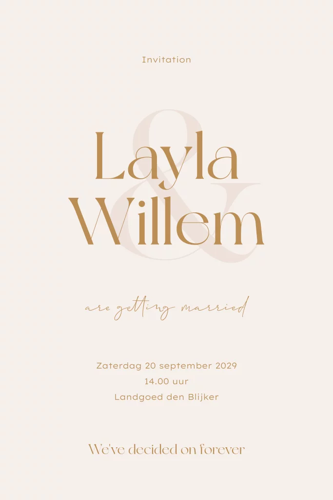 Een stijlvolle trendy huwelijksuitnodiging! Deze trouwkaart is in beige kleurtint vormgegeven met verschillende lettertypes en een groot &-teken. Pas teksten en kleuren aan in onze online editor voor jullie persoonlijke touch. Maak deze kaart helemaal af met de bijpassende zandkleur envelop en sluitzegel met trouwringen.