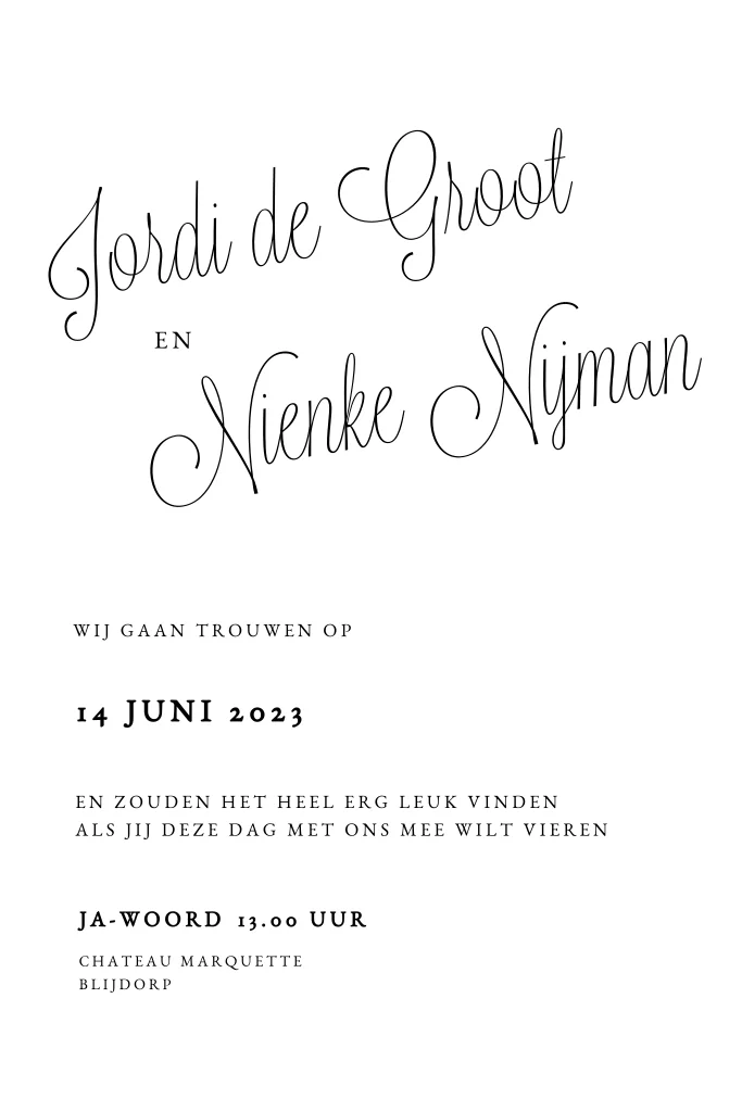 Stuur deze mooie cleane trouwkaart naar de genodigden voor jullie huwelijk. Deze uitnodiging in zwart wit is rustig en heeft een combinatie van een sierlijk lettertype met een strak lettertype.