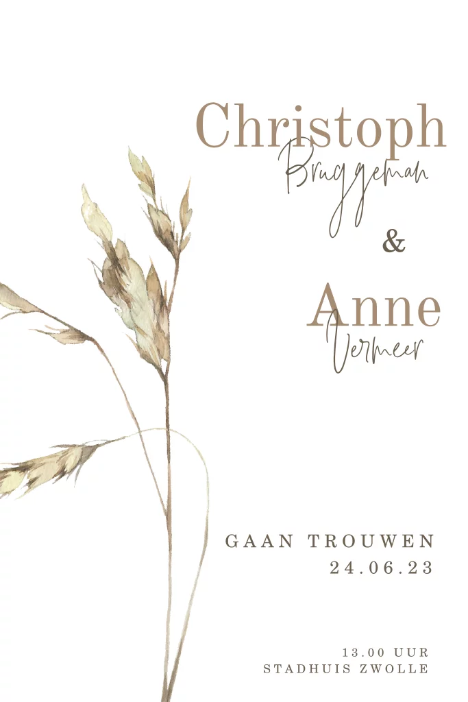 Mooie rustige huwelijksuitnodiging met een gedroogd grastakje. Maak van deze kaart je eigen persoonlijke trouwkaart. De teksten zijn gemakkelijk aan te passen in de editor.