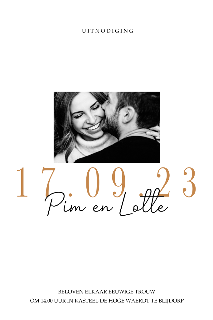 Op deze cleane foto trouwkaart zien jullie gasten meteen wanneer jullie gaan trouwen. De datum van jullie huwelijksdag staat groot op de voorzijde van de kaart. De namen van het bruidspaar staan er in een sierlijk lettertype onder. De kaart is overwegend wit en oogt daardoor rustig. Maak van deze kaart je eigen persoonlijke trouwkaart.
