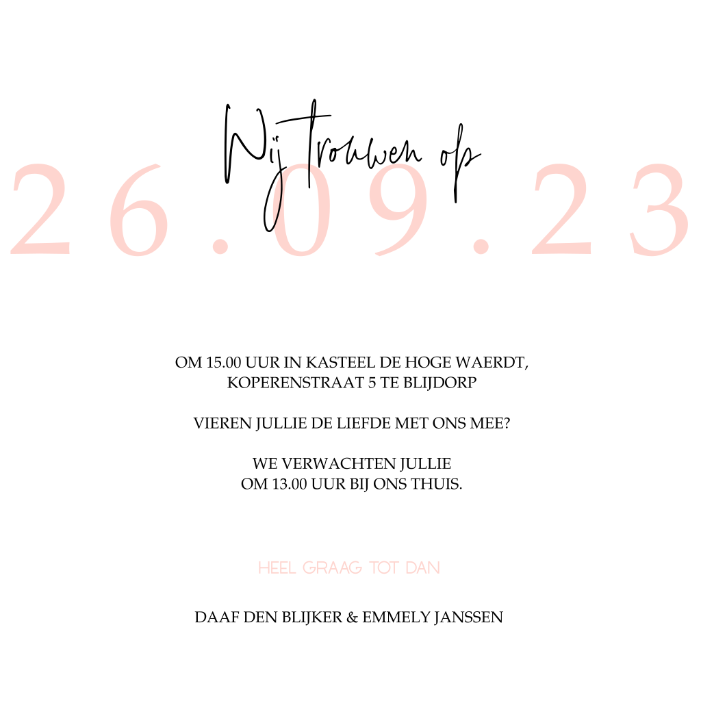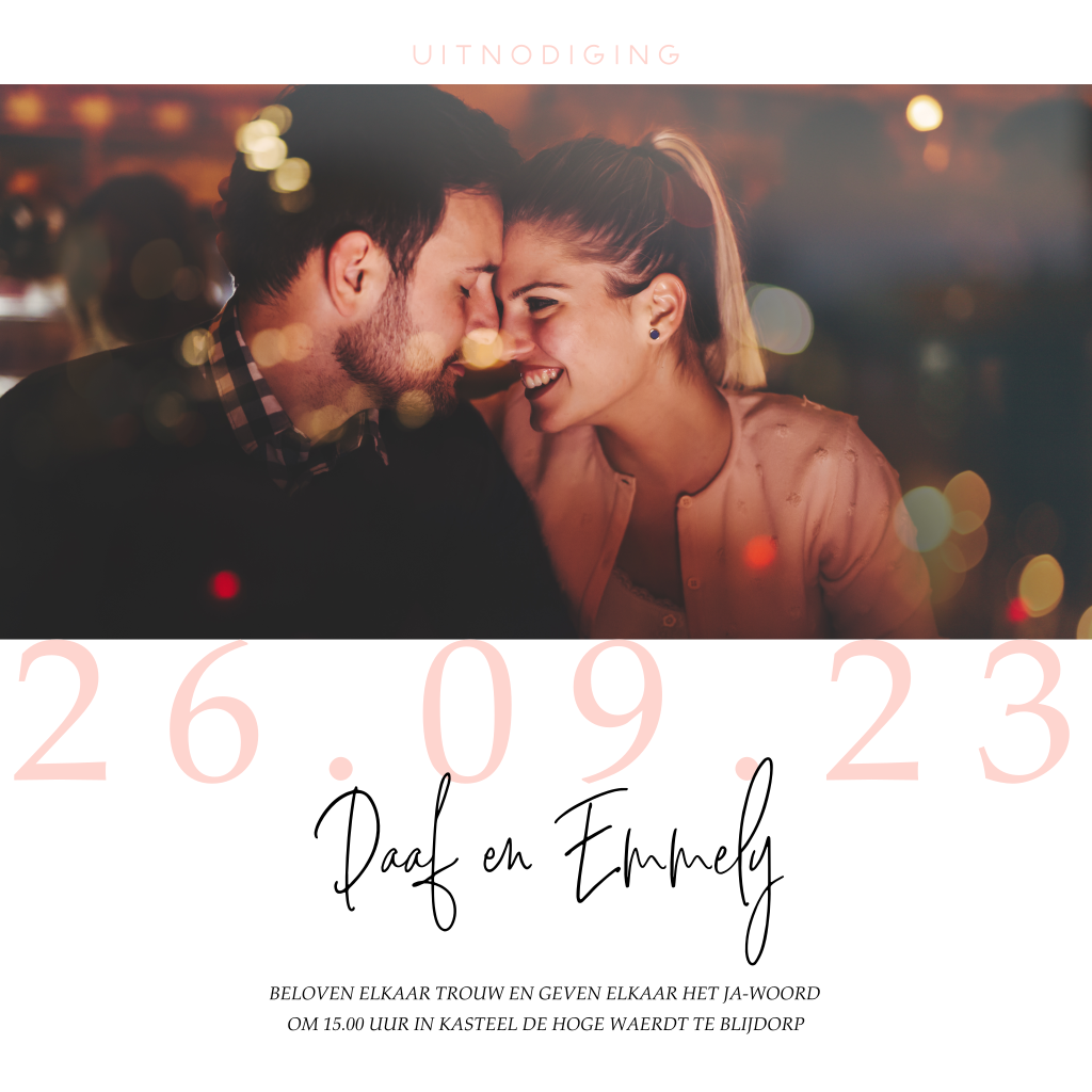 Hippe trouwkaart met eigen foto. De datum van jullie huwelijk staat groot op de kaart in een strak lettertype. Dit gecombineerd met een sierlijk lettertype waarin de namen van het bruidspaar staan. Maak van deze kaart je eigen persoonlijke huwelijksuitnodiging. Lettertypes en kleuren zijn aan te passen in de editor.