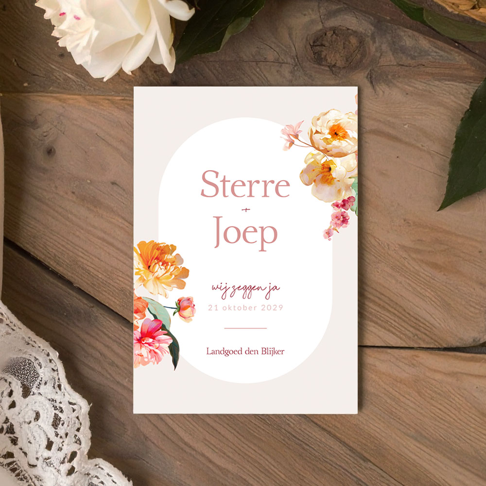 Een romantische huwelijksuitnodiging met bloemen in waterverf. Deze trouwkaart heeft lichte roze en peach pasteltinten met in het midden een wit boogvormig kader waar de tekst voor jullie bruiloft in past. In de hoeken zie je prachtige romantische bloemen. Perfect voor een romantische bruiloft in de lente of zomer.
