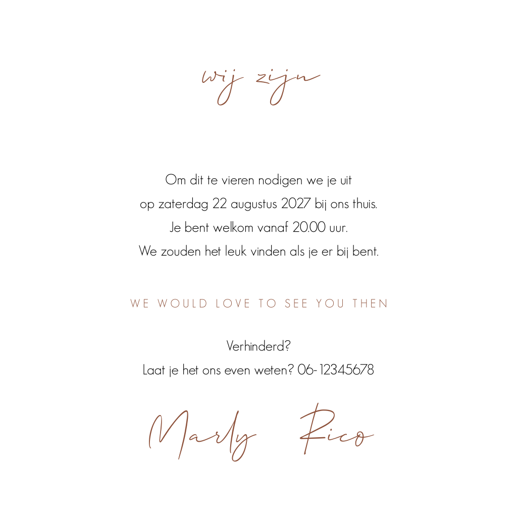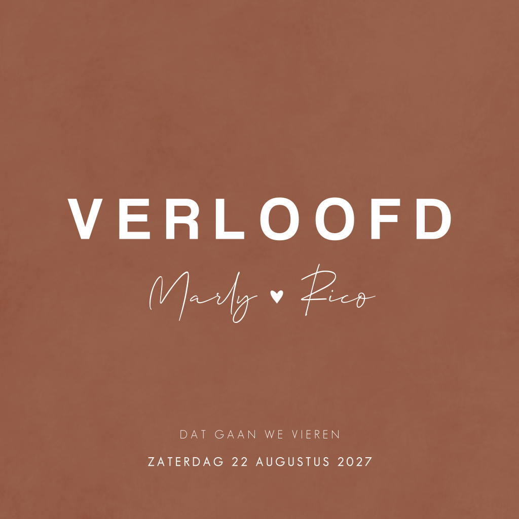 Luxe basic verlovingskaart met de tekst "verloofd" in schitterend goudfolie. De glanzende foliedruk geeft deze uitnodigingskaart een luxe uitstraling. Verder op deze uitnodiging een mooie combinatie van sierlijke en strakke lettertypes voor een bruine betonlook achtergrond. Hulp nodig bij het aanpassen? We staan voor je klaar!