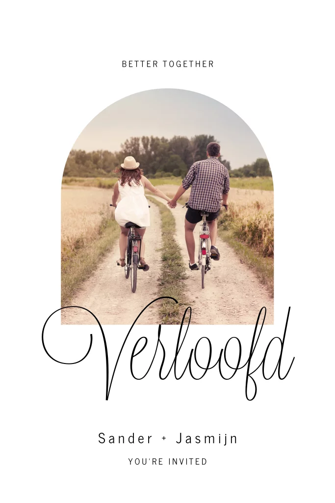Ten huwelijk gevraagd en willen jullie dit heugelijke feit vieren? Nodig je gasten uit met deze witte verlovingskaart met foto in boogvorm. Voeg je eigen, meest liefdevolle foto van jullie samen, toe aan deze cleane verlovingsuitnodiging. Je kunt de kaart zelf bewerken in de editor en naar je eigen wensen aanpassen. Ook kun je de uitnodigingen met onze verzendservice direct door ons laten versturen.