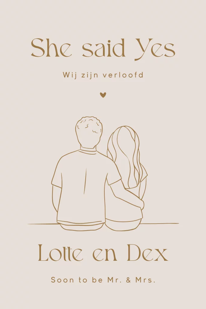Ontdek deze stijlvolle verlovingskaart met een lijntekening. Op deze kaart zie je een lijntekening van een verloofd koppel met de tekst 'She said yes'. De zand envelopkleur past perfect bij deze beige verlovingskaart.