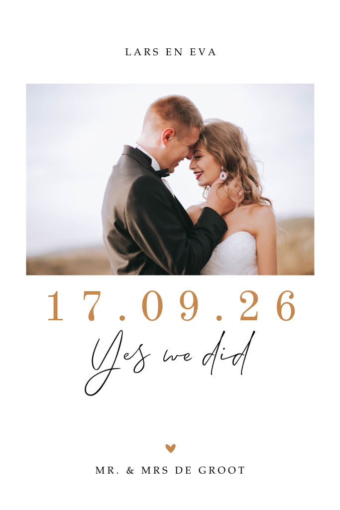 Zijn jullie in kleine kring getrouwd, of heb je je bruiloft aangepast moeten vieren? Verstuur dan deze " wij zijn getrouwd" kaart om familie en vrienden op de hoogte te brengen. Op deze kaart een mooie foto van jullie dag met daaronder groot de datum. De tekst " Yes we did" staat in een sierlijk lettertype. Deze kaart is basic, clean en hip tegelijk!