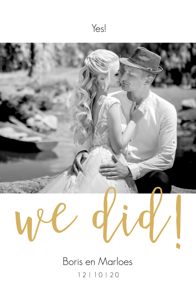 Mooie "wij zijn getrouwd" kaart om familie en vrienden te laten weten dat jullie elkaar het ja woord hebben gegeven. Voeg jullie mooiste trouwfoto toe. Onder de foto staat de tekst "we did!" in een gouden kleur. Verder is de kaart overwegend wit en oogt clean en rustig. Pas teksten en kleuren naar je eigen smaak aan in de editor.