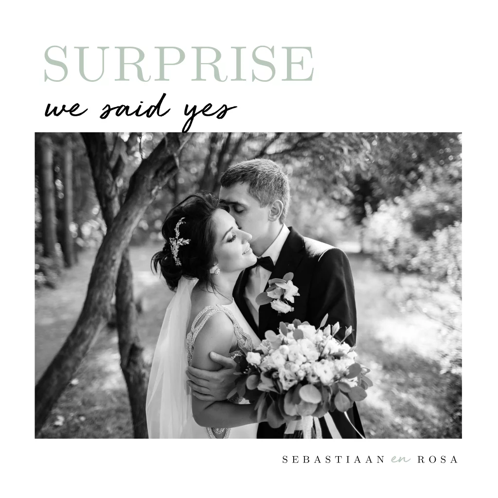 Surprise! We said yes! Wil je familie en vrienden verrassen met het blije nieuws dat jullie elkaar het ja woord hebben gegeven? Stuur dan deze leuke kaart met eigen foto ter kennisgeving van jullie huwelijk.