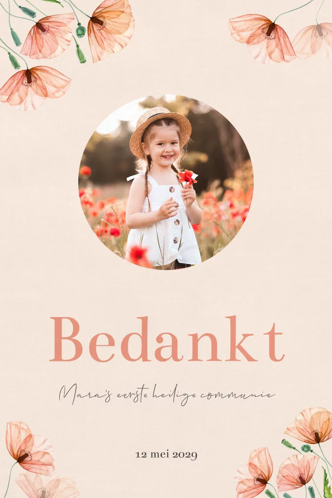 Een schattige bedankkaart voor een eerste communie. Deze bedankkaart heeft mooie klaprozen met een lichtroze achtergrond. Pas de foto aan voor de persoonlijke touch en bedank iedereen die naar de communie is gekomen.