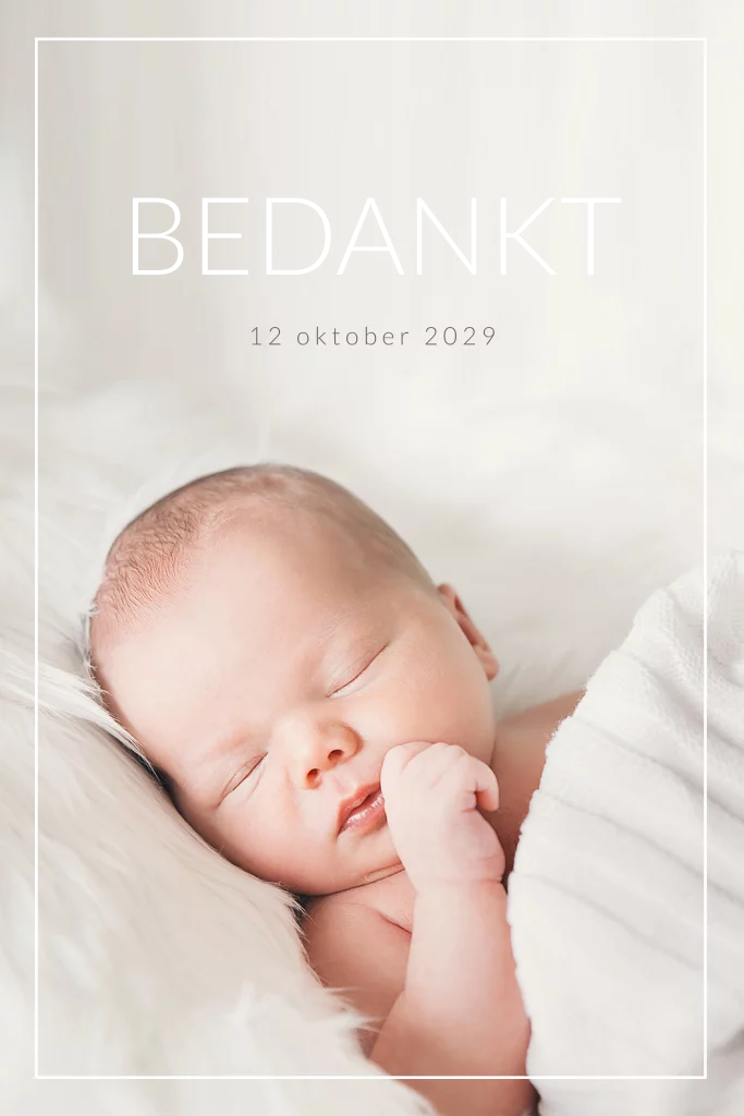 Een bedankkaart voor het doopsel met goudfolie en kader. Het folie zorgt voor een extra vleugje luxe. Plaats een eigen foto van jullie kleintje op deze bedankkaart voor de persoonlijke touch. Open de online editor om de bedankkaart naar eigen wens te bewerken. Hulp nodig? We helpen je graag!