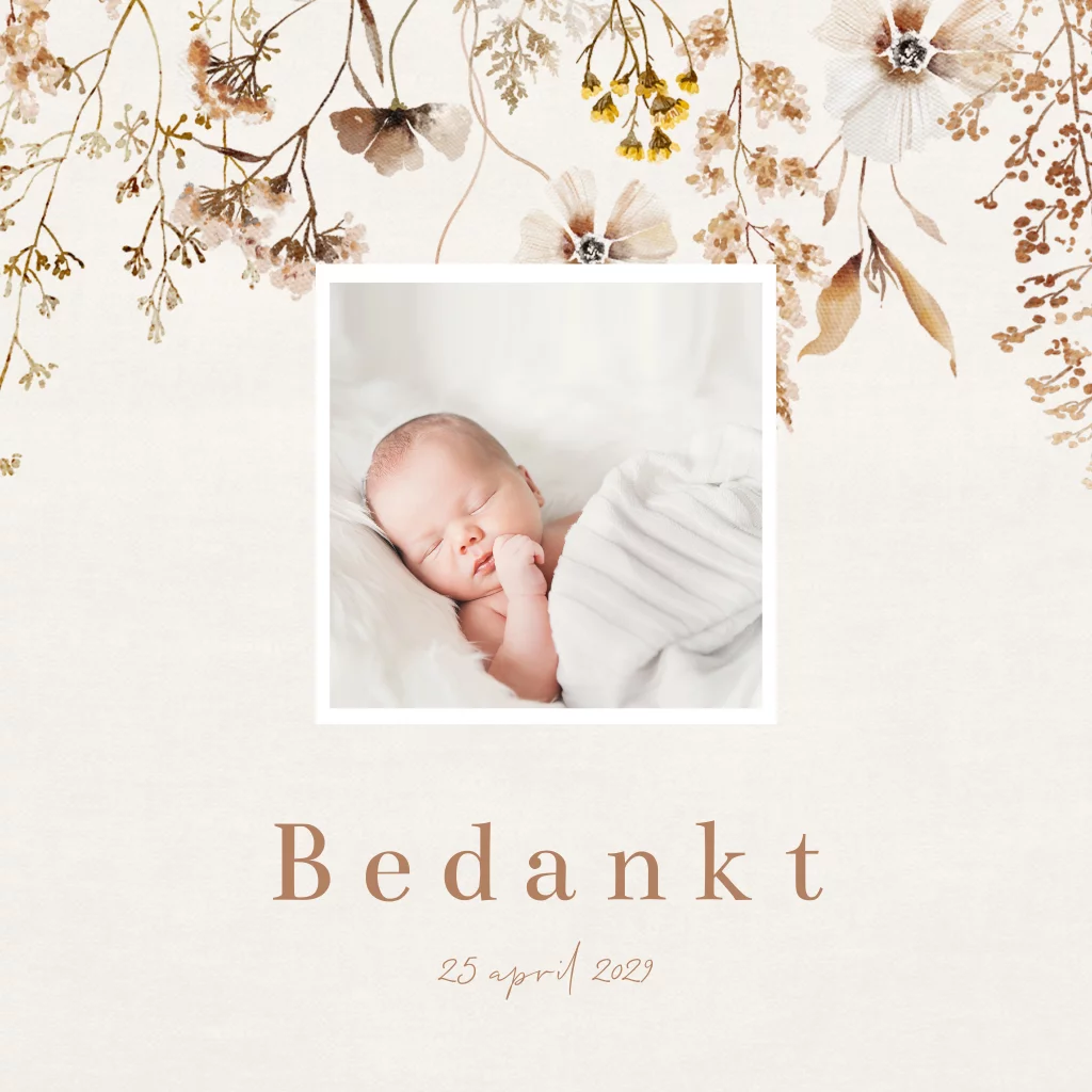 Een prachtige bedankkaart voor een doopsel. Deze bedankkaart heeft een linnenlook achtergrond met mooie veldbloemen. Voeg een eigen foto toe van jullie kindje. Pas alles naar eigen wens aan in de online editor.