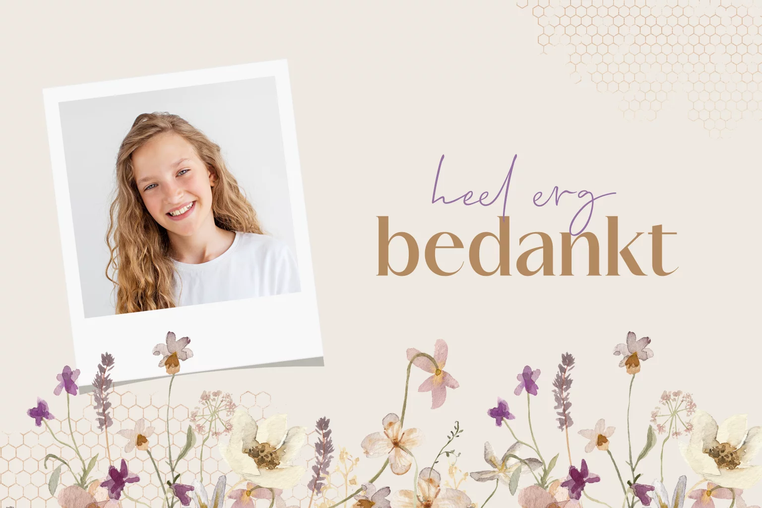 Een vrolijke bedankkaart voor een vormsel. Deze bedankkaart heeft aquarel bloemen en een kader voor een eigen foto. Voeg een eigen foto toe in de online editor voor de persoonlijke touch. Bedank op een leuke manier de mensen die bij het vormsel zijn geweest met deze subtiele bedankkaart.