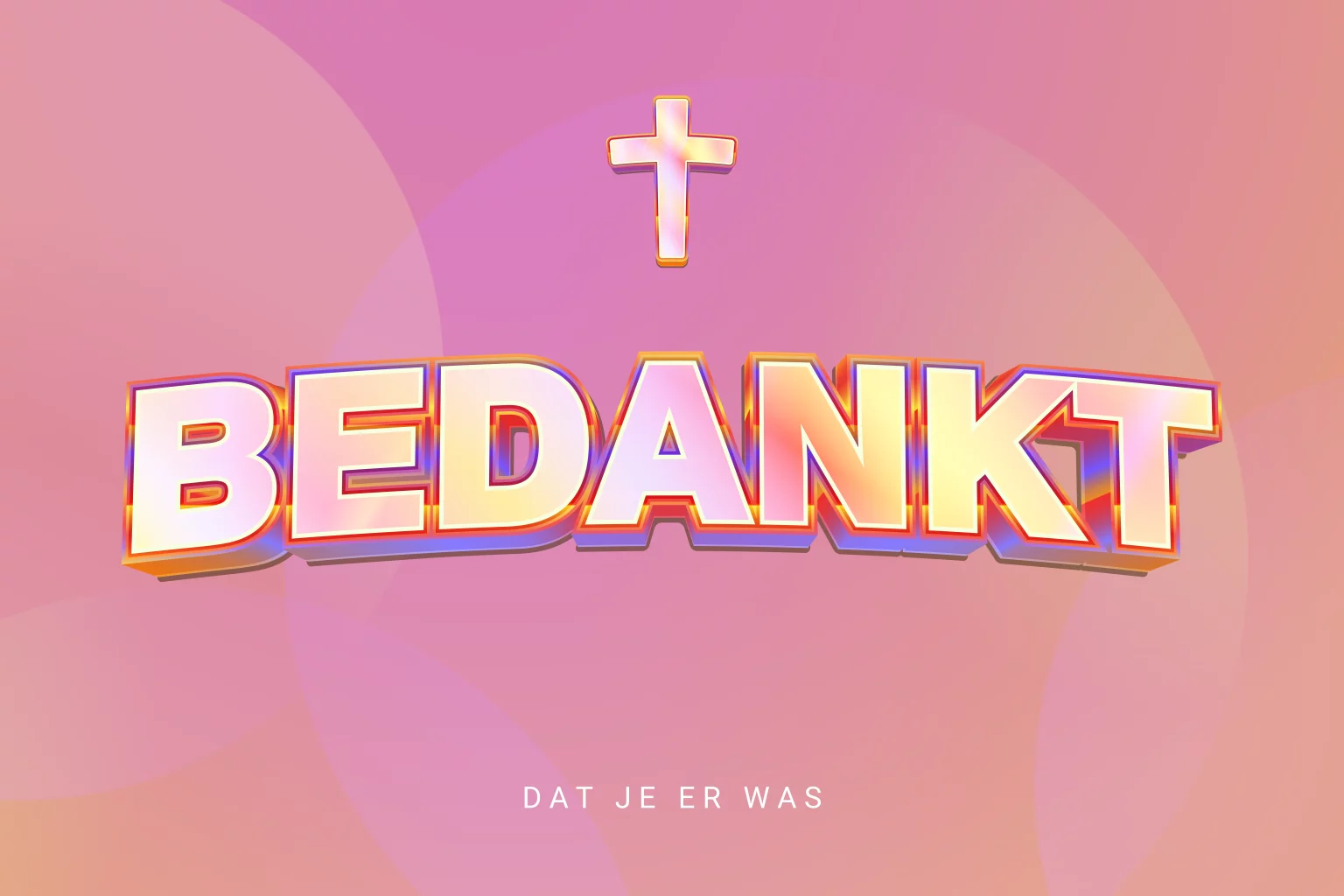 Bedankkaart voor een vormsel in felle roze kleuren met in 3D-letters de tekst 'Bedankt' en een heilig kruis. Deze bedankkaart is vrolijk. Je kunt deze kaart zelf gemakkelijk bewerken, opslaan en bestellen. Vragen of wensen? Laat het gerust weten, wij helpen je graag.