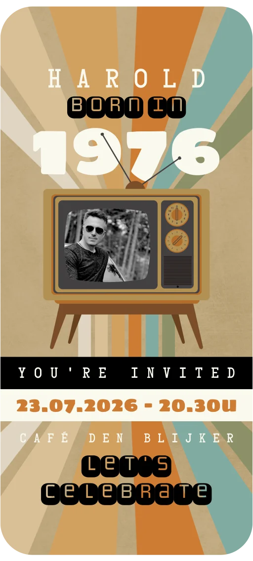 Verstuur een bewegende digitale uitnodiging en nodig zo je vrienden en familie uit voor je 50ste verjaardag. Handig en snel met een leuke animatie. De strepen op de achtergrond, de tv en het jaartal '1976' zijn geanimeerd. Deze digitale uitnodiging voor een verjaardag heeft een retro look met retro tv. Zet hierin een eigen foto.