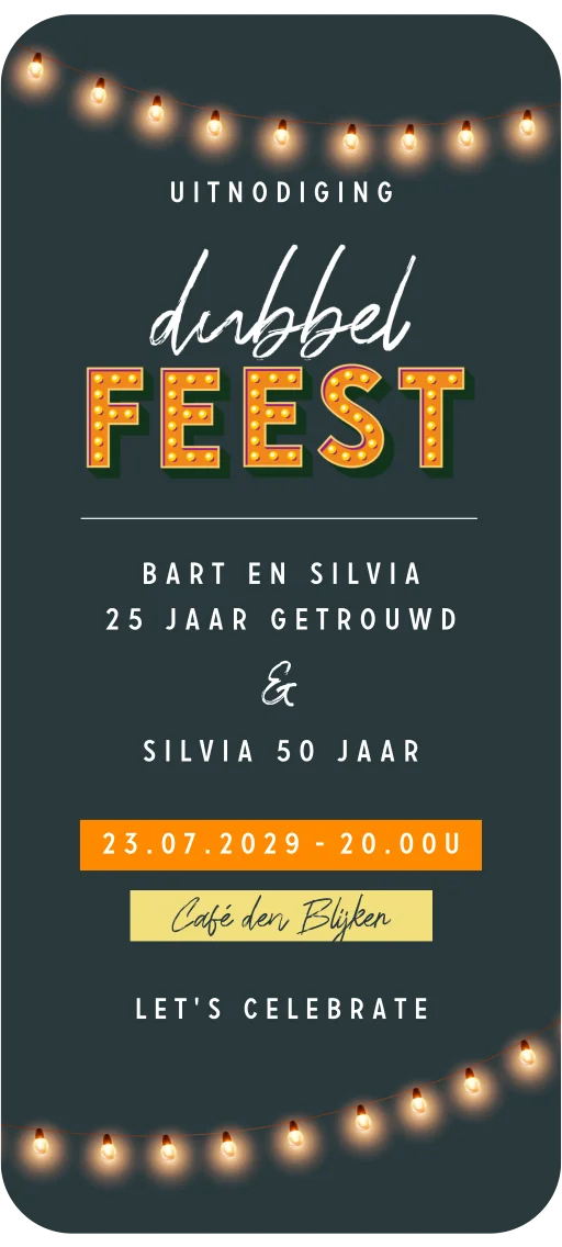 Twee mijlparen te vieren? Verstuur dan een dubbel feest uitnodiging en vier zo jullie 25-jarig huwelijksjubileum en 50ste verjaardag. Verstuur deze bewegende digitale uitnodiging, handig en snel met een leuke animatie. De uitnodiging is feestelijk met een donkere achtergrond, sfeervolle lampjesslinger en feestletters in festivalstijl. De confetti en de tekst 'dubbel' is geanimeerd.