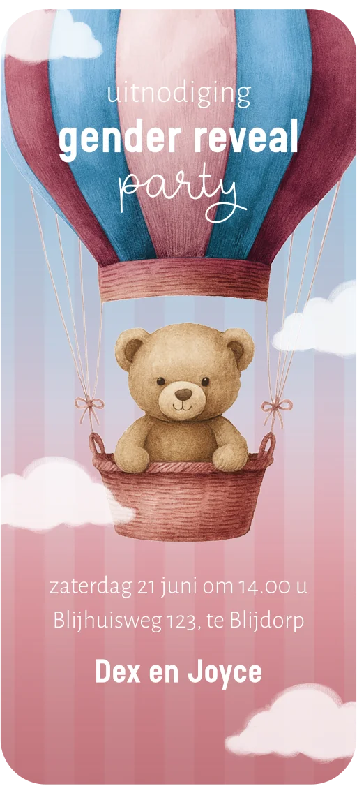 Gender reveal party uitnodiging als digitale uitnodiging, handig te versturen via je mobiel. Deze digitale uitnodiging heeft een schattig roze met blauw design, perfect passend bij een gender reveal. Wordt het een jongen of een meisje? De uitnodiging is geanimeerd. Je ziet een beertje in een luchtballon, zwevend tussen de voorbijdrijvende wolken.