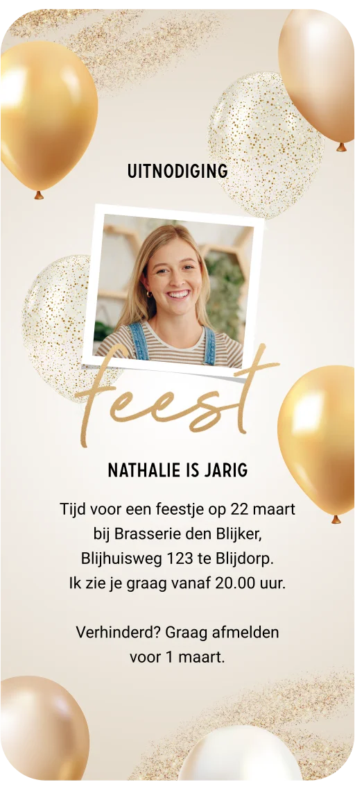 Digitale party uitnodiging voor een verjaardag. Deze uitnodiging is geanimeerd en feestelijk met poppende confetti en zwevende ballonnen. Zet een eigen foto in het fotokader en maak zo de verjaardagsuitnodiging persoonlijk.