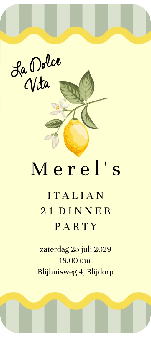 Feestelijke digitale uitnodiging voor een 21 diner! Op de achtergrond van deze digitale uitnodiging een gestreepte groene achtergrond met daarvoor een geel golvend kader met een fantastische citroen in het midden. Helemaal in Italiaanse sferen en La Dolce Vita! Proost samen op een onvergetelijk diner! Maak de set compleet met een bijpassende menukaart en/of naamkaartjes te bestellen!