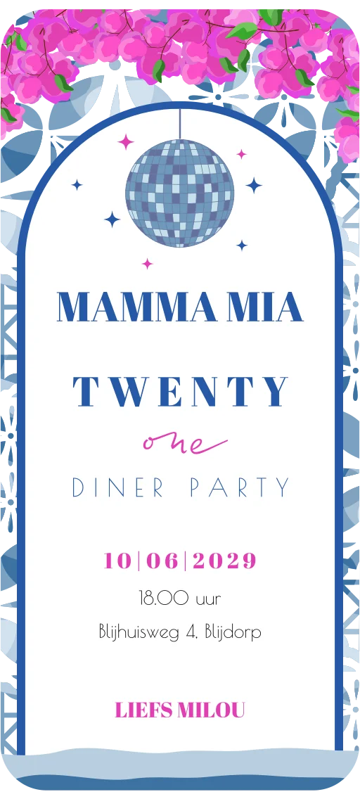 Organiseer een 21 diner met een Mamma Mia thema. Deze digitale uitnodiging is daar zeker geschikt voor. Op deze digitale uitnodiging zie je opvallende bloemen, een boogkader en een discobal. De Mamma Mia uitnodiging is naar eigen wens aan te passen. Maak je 21ste verjaardag compleet met deze prachtige digitale uitnodiging en maak er een onvergetelijke verjaardag van.