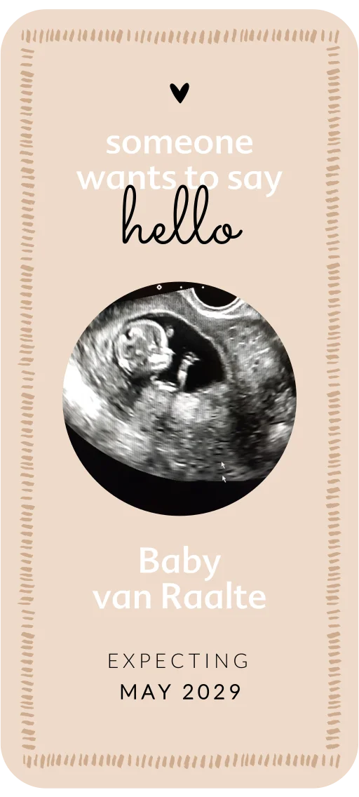 Verwachten jullie een baby? Deel dit heugelijke nieuws met familie en vrienden met deze mooie digitale zwangerschapsaankondiging. Zet jullie eigen echo in het fotokader.