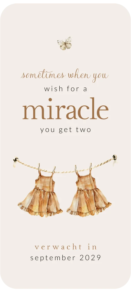 Verwachten jullie een tweeling en willen jullie de zwangerschap op een eenvoudige maar ook mooie manier aankondigen? Kies dan voor deze lieve digitale zwangerschapsaankondiging voor een tweeling. Op de digitale aankondiging zie je aan een lijntje twee jurkjes hangen. De aankondiging heeft een mooie vintage uitstraling in beige met bruine tinten.