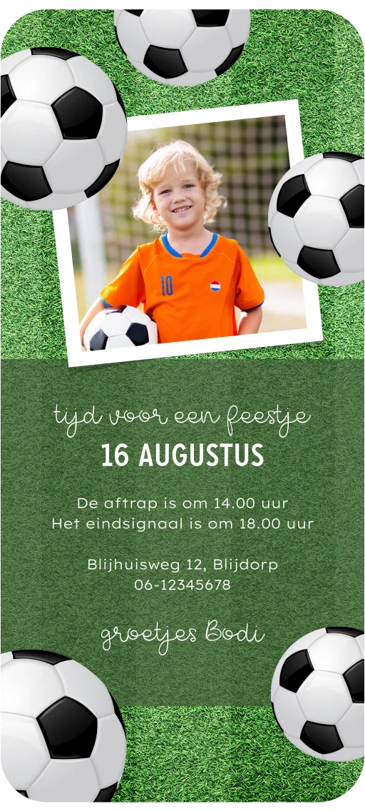 Geanimeerde uitnodiging voor een kinderfeestje. Deze uitnodiging is voor een jongen die van voetbal houdt en een voetbalthema kinderfeestje geeft. Je ziet een grasveld met stuiterende voetballen. Zet in het kader een foto van de jarige job.