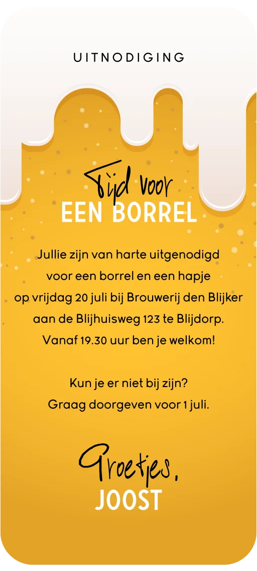 Vier je verjaardag of een ander feestje en nodig je vrienden uit met deze originele digitale uitnodiging voor een borrel. De uitnodiging heeft de look van een bierglas met schuimkraag.