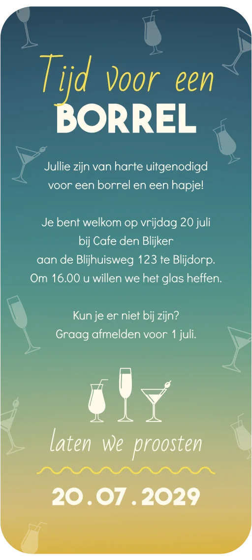 Iets te vieren? Laat dit niet zomaar voorbij gaan en nodig gemakkelijk en snel je gasten uit voor een borrel met deze digitale uitnodiging. Op de digitale uitnodiging staan verschillende glazen drinken.