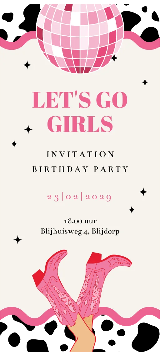 Hoe leuk én handig, verstuur je verjaardagsuitnodiging via je mobiel en nodig zo al je vriendinnen uit voor je birthday party, let's go girls! Deze digitale uitnodiging heeft een cowgirl thema koeienvlekken en cowboylaarzen. De sprankelende discobal maakt het helemaal af.