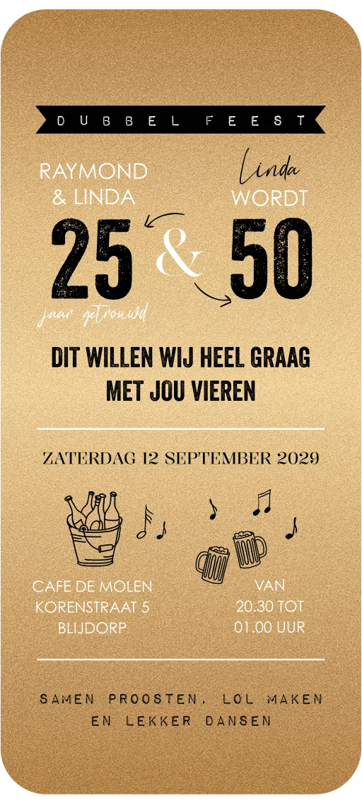 Zijn jullie 25 jaar getrouwd en wordt er iemand 50 jaar? Tijd voor een dubbel feest! Deze digitale kaart heeft een goudlook achtergrond met verschillende lettertypes, wijn, bier en muziek. Een echte feestelijke uitnodiging dus! Natuurlijk is het mogelijk om 25 jaar getrouwd of 50 jaar aan te passen naar andere getallen.