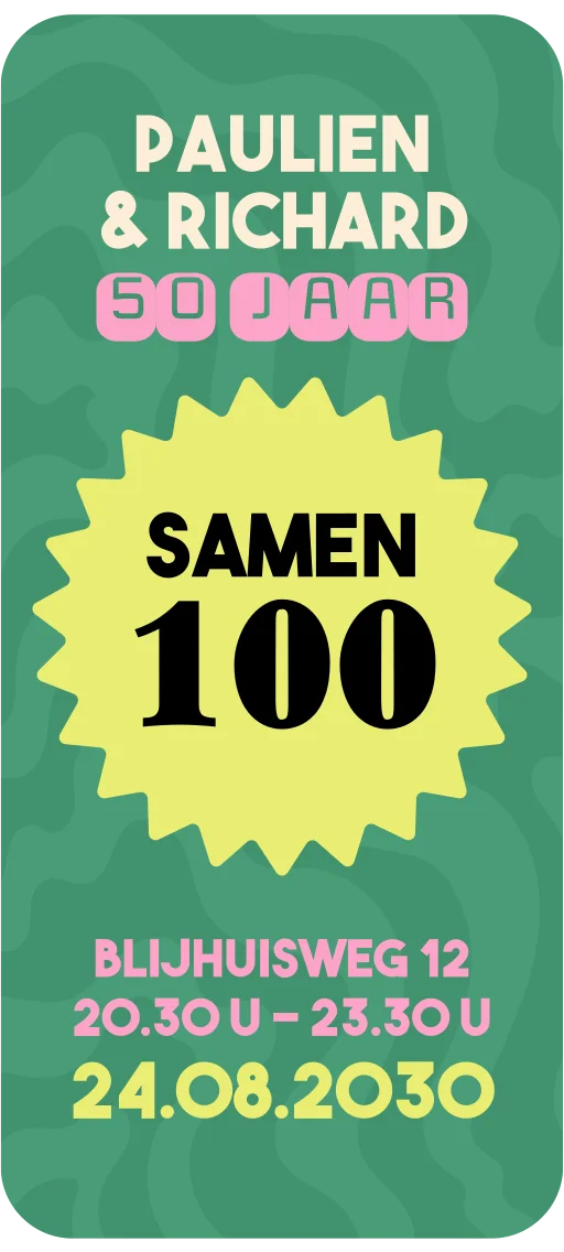 Kleurrijke digitale uitnodiging om te vieren dat jullie beiden 50 jaar worden en dus Sarah en Abraham zien. Deze dubbel feest uitnodiging van samen 100 heeft een groene achtergrond met typografische gekleurde teksten.