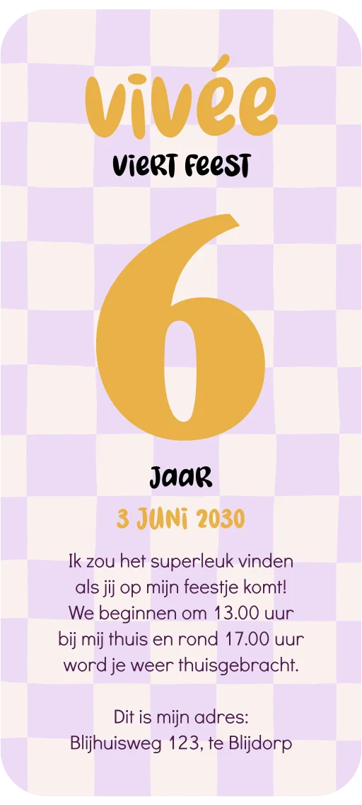 Vrolijke digitale uitnodiging voor een kinderfeestje van een meisje. Deze digitale uitnodiging heeft een lila met wit blokpatroon en in geel de leeftijd 6. Deze digitale uitnodiging is geschikt voor een verjaardag maar ook zeker voor een communie, vormsel of lentefeest.
