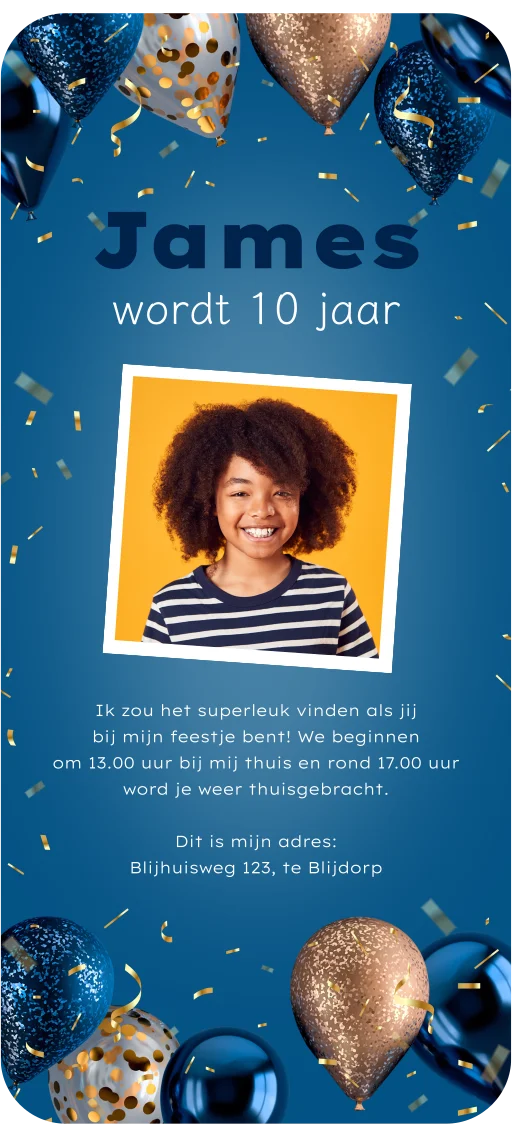 Feestelijke digitale uitnodiging voor een kinderverjaardag voor 10 jaar. Op deze blauwe digitale uitnodiging zie je ballonnen met gouden confetti. Voeg een leuke foto toe om je eigen persoonlijke uitnodiging te maken. De leeftijd is gemakkelijk aan te passen naar andere getallen.