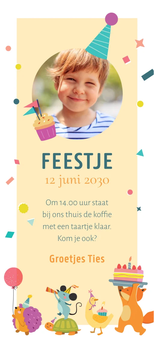 Feestelijke digitale uitnodiging voor een kinderverjaardag. Een leuke digitale uitnodiging voor een de verjaardag van je zoon of dochter. Deze digitale uitnodiging heeft een vrolijk design met kleurrijke confetti en schattige diertjes die feest vieren. Voeg een leuke foto toe van je kleine om de uitnodiging nog wat persoonlijker te maken.