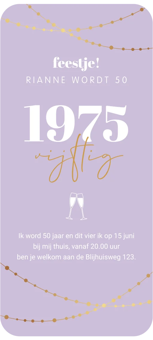 Word je dit jaar 50? Laat deze mijlpaal niet zomaar voorbij gaan zonder feestje en natuurlijk een unieke uitnodiging, een digitale uitnodiging! Zo nodig je makkelijk en snel al je gasten uit. De uitnodiging heeft een lila kleur achtergrond met een goudkleurige slinger. In grote witte cijfers staat je geboortejaar 1975 met daaronder in sierlijke letters 'vijftig' en proostende champagneglazen.