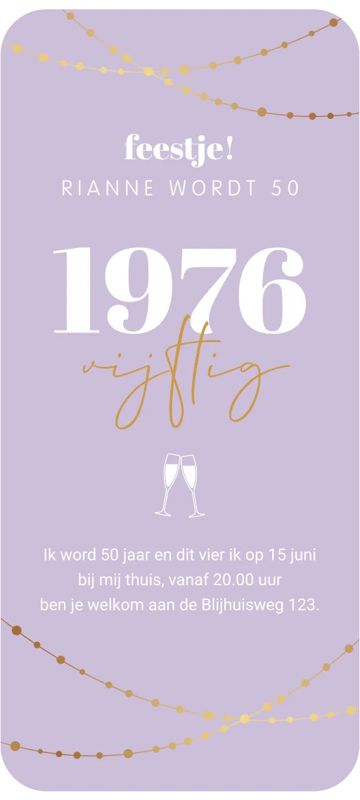 Word je dit jaar 50? Laat deze mijlpaal niet zomaar voorbij gaan zonder feestje en natuurlijk een unieke uitnodiging, een digitale uitnodiging! Zo nodig je makkelijk en snel al je gasten uit. De uitnodiging heeft een lila kleur achtergrond met een goudkleurige slinger. In grote witte cijfers staat je geboortejaar 1976 met daaronder in sierlijke letters 'vijftig' en proostende champagneglazen.