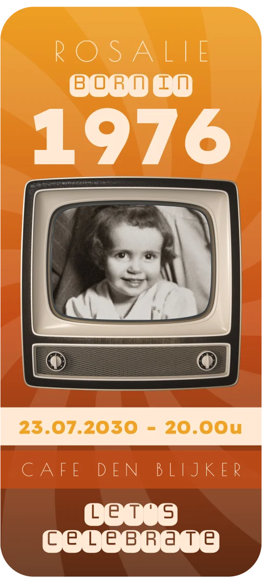 Digitale uitnodiging voor een 50e verjaardag. Deze uitnodiging is digitaal en kun je eenvoudig via whats app versturen. De uitnodiging is voor iemand die 50 jaar wordt en dus Sarah of Abraham ziet. Je ziet een jaren '70 design met oranje kleuren en een ouderwetse televisie waar je je eigen foto in kunt zetten. Bewerk je kaart direct in onze online editor met je eigen teksten en afbeeldingen. De bestelling wordt automatisch als digitale versie verwerkt. Je hoeft verder niets te selecteren. Binnen één werkdag sturen we je het gepersonaliseerde bestand – zonder watermerk logo – als PNG bestand (formaat: 1080 × 2400 px) via de mail. Hulp nodig bij het ontwerpen? Neem contact met ons op!