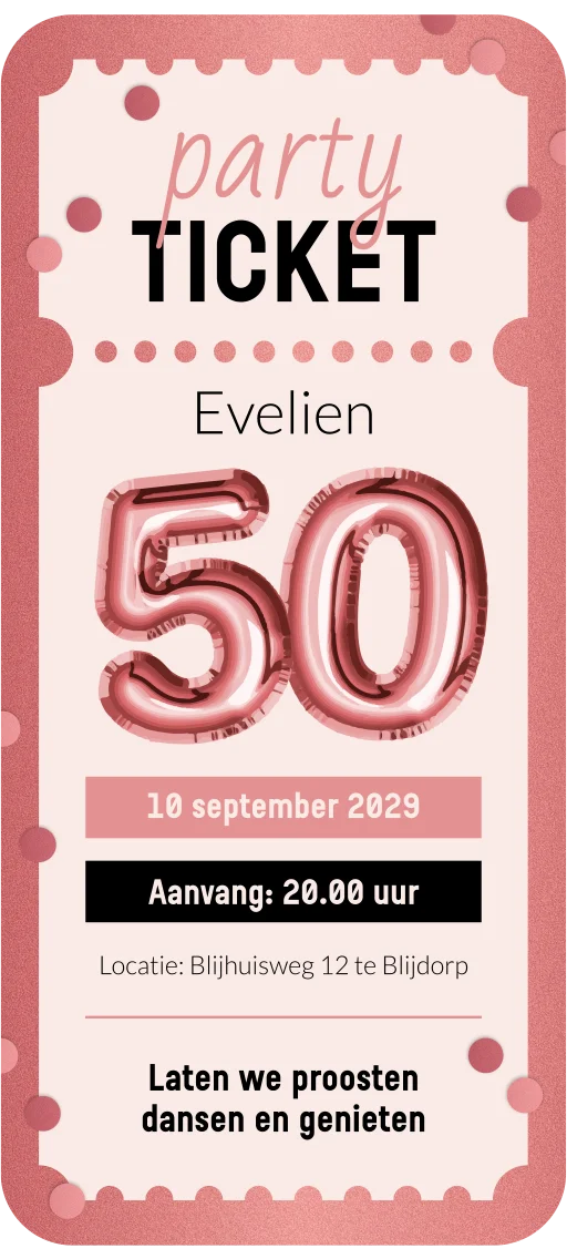 Word je dit jaar 50? Laat deze mijlpaal niet zomaar voorbij gaan zonder feestje en natuurlijk een unieke uitnodiging, een digitale uitnodiging in ticketstijl! Zo nodig je makkelijk en snel al je gasten uit. De uitnodiging heeft een donkerroze kleur achtergrond met confetti. De cijfers '50' staan als ballonnen op de digitale uitnodiging.