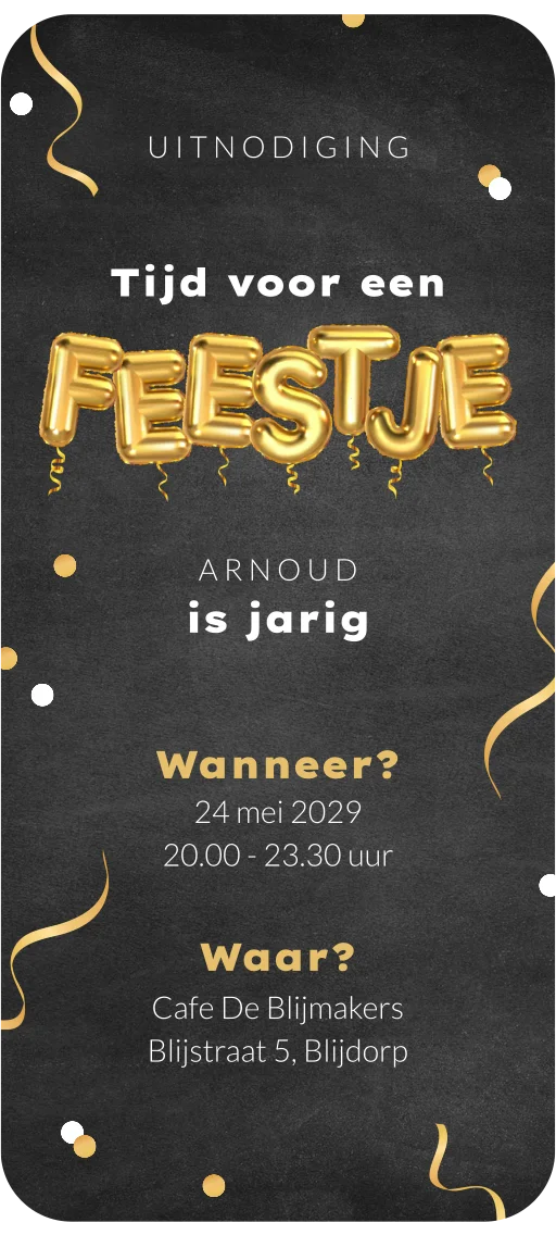 Tijd voor een feestje! Nodig eenvoudig je vrienden uit met deze feestelijke digitale uitnodiging voor een verjaardag. De uitnodiging heeft een zwarte achtergrond met gouden confetti en ballonnen met de tekst 'feestje'.