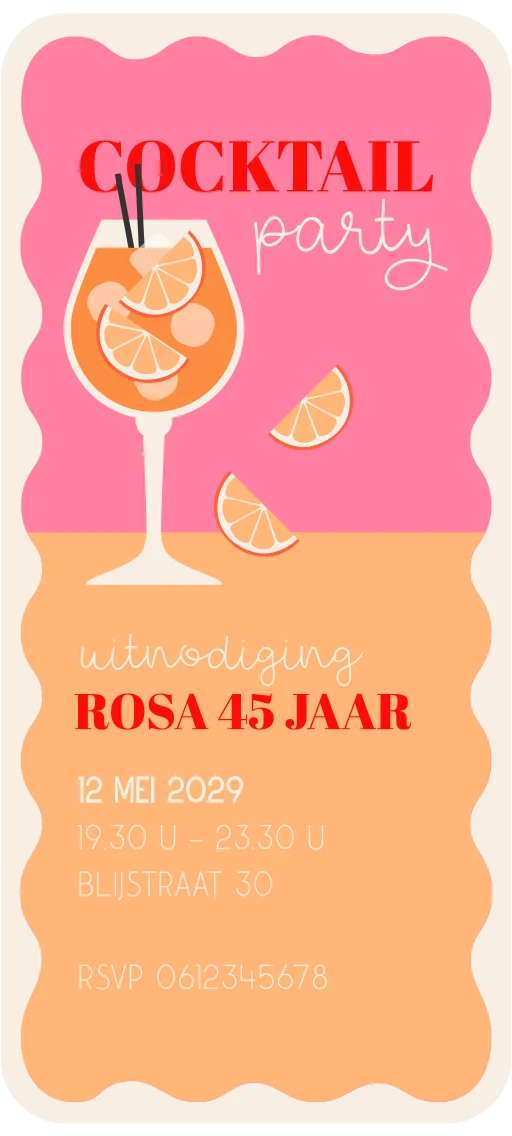 Binnenkort jarig en wil je een cocktail party geven? Dan past deze digitale uitnodiging hier perfect bij. Op de digitale uitnodiging zie je twee felle kleuren, oranje en roze met een golvende rand. Natuurlijk kan het cocktailglas niet ontbreken!