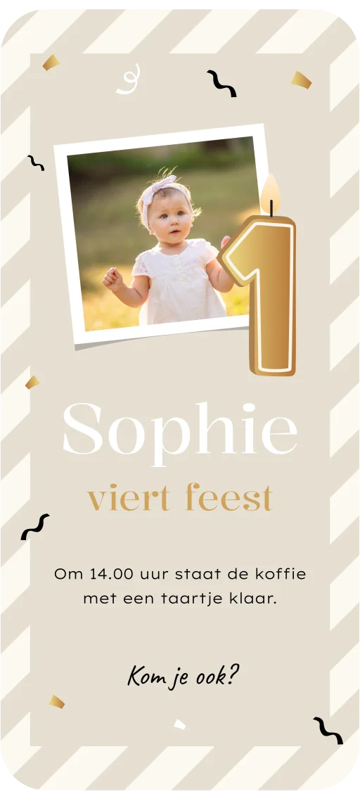 Digitale uitnodiging voor een eerste verjaardag van een meisje of jongen. Deze uitnodiging voor een kinderfeest is digitaal en kun je gemakkelijk versturen via je je mobiel. De uitnodiging heeft beige kleuren met een gestreepte achtergrond, confetti en een verjaardag kaarsje in het cijfer 1. Zet in het kader een foto van je kleintje. Deze digitale uitnodiging is geschikt voor een kinderfeest, voor een 1e verjaardag maar ook zeker voor een doopfeest.