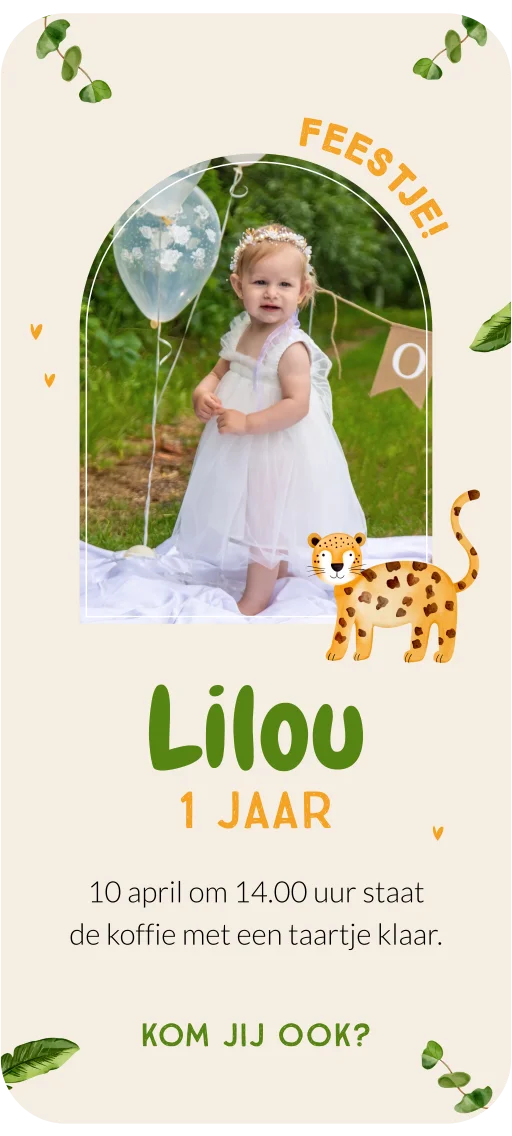 Digitale uitnodiging voor een eerste verjaardag van je kleine. Vier de 1e verjaardag met deze vrolijke dieren uitnodiging die je gemakkelijk via je je mobiel verstuurd. Op de digitale uitnodiging zie je een schattig pantertje en groene bladeren. Zet in het boogvormige kader een foto van jullie kleine meisje of jongen.
