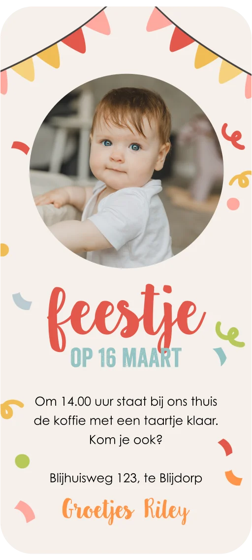 Feestelijke digitale uitnodiging voor een kinderverjaardag. Een leuke digitale uitnodiging voor een eerste verjaardag van je zoon of dochter. Op deze digitale uitnodiging zie je een beige achtergrond met kleurrijke confetti en een vlaggenslinger. Voeg een leuke foto toe van je kleine om de uitnodiging nog wat persoonlijker te maken.