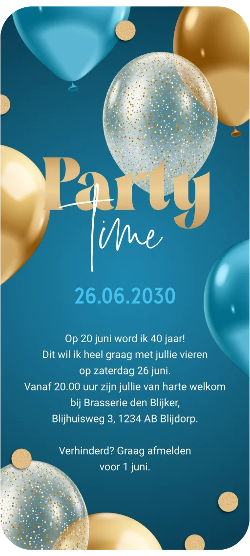 Party time! Digitale verjaardagsuitnodiging met feestelijke ballonnen in goud en blauw met confetti.