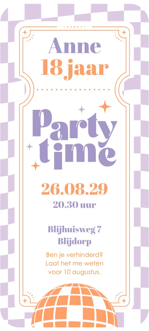 18 jaar geworden? Dan is het party time! Nodig je vrienden uit voor een disco feest met deze hippe digitale uitnodiging. De uitnodiging heeft een paars met wit blokken patroon met daarvoor een ticket met de tekst.